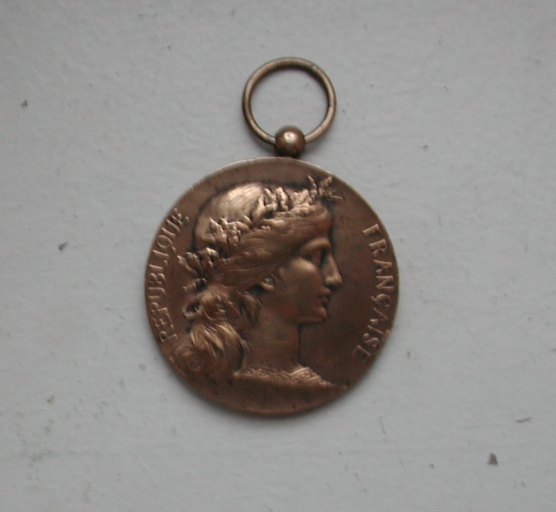 Vue du recto de la médaille donnée par la municipalité de St-Jacut à Pierre Aubin (père) pour services rendus, 1912Immatriculation