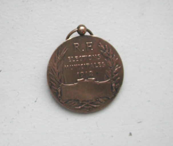 Vue du verso de la médaille donnée par la municipalité de St-Jacut à Pierre Aubin (père) pour services rendus, 1912Immatriculation