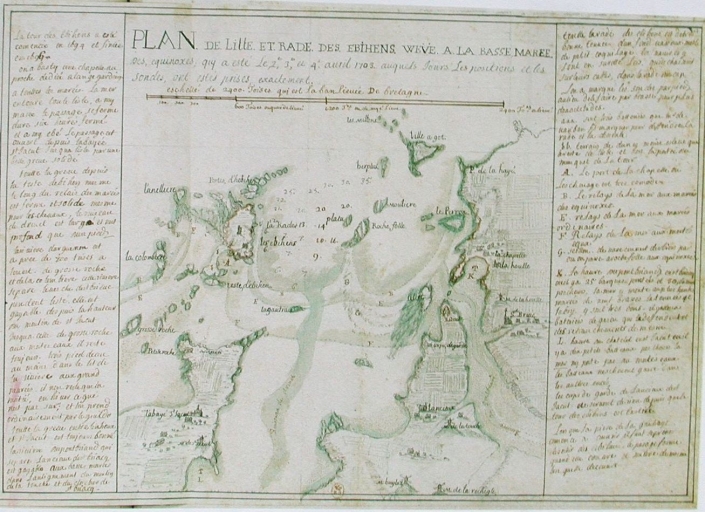 Détail : plan de la rade des Ebihens à basse mer d'équinoxe, les 2, 3, 4 avril 1703, avec le texte descriptif par le comte de Pontbriand, capitaine garde-côtes : remarquer le havre du Châtelet (SHAT, Vincennes)Immatriculation