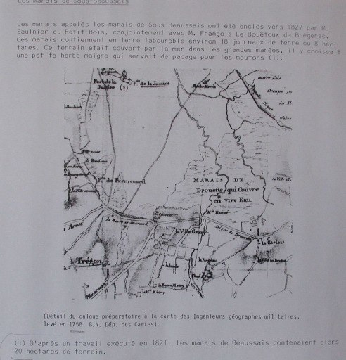 Calque préparatoire de la carte des Ingénieurs Géographes datée de 1758 : la baie de Beaussais, remarquer le moulin ruiné indiqué et la 'Marne de Marand' et la digue de Drouet (Conservatoire du Littoral)Immatriculation