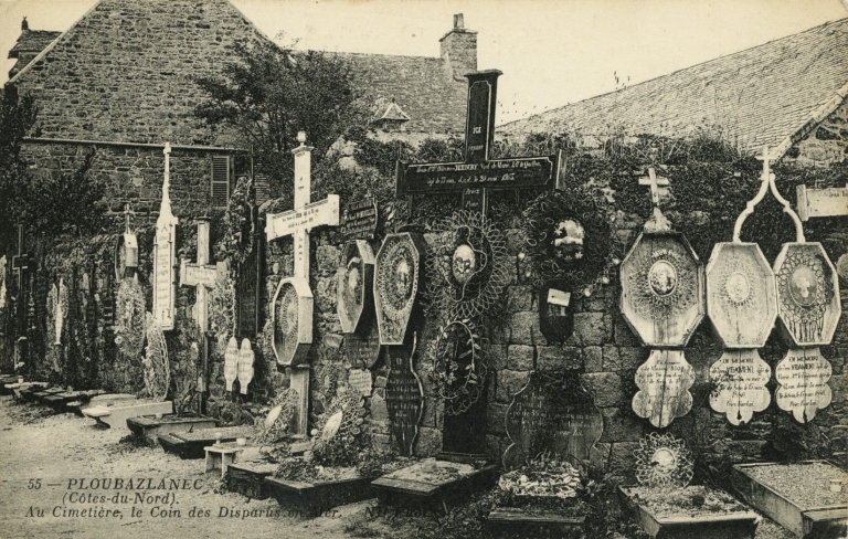 Le 'Mur des Disparus', 1er quart 20e siècle : remarquer les premières plaques en bois et les nombreuses couronnes en perles (carte postale, AD 22)Immatriculation