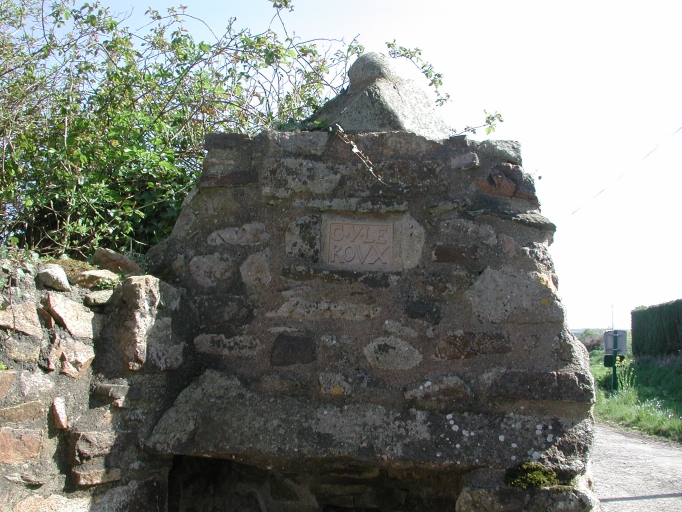 Vue de détail du fronton avec la plaque en céramique : 'Le Roux'Immatriculation