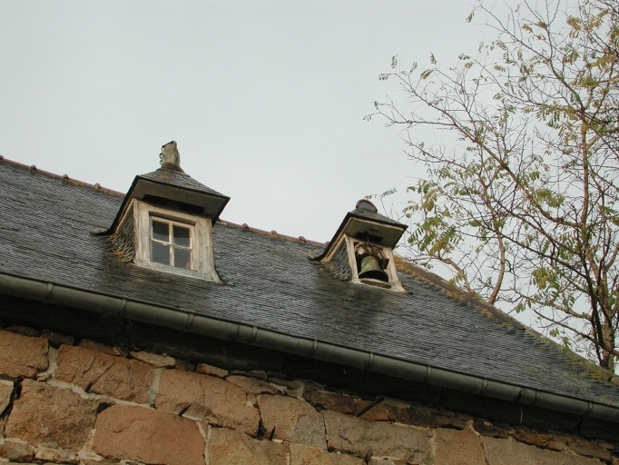 Vue de détail des lucarnes sous combles : remarquer les épis de faîtage et le lanterneau latéral abritant une cloche datée de 1649Immatriculation