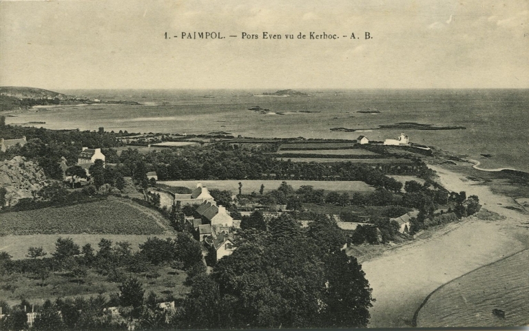 Vue des espaces littoraux cultivés et urbanisés de Kerroc'h à Pors Don, début 20ème siècle (AD 22, carte postale, 16 Fi)Immatriculation