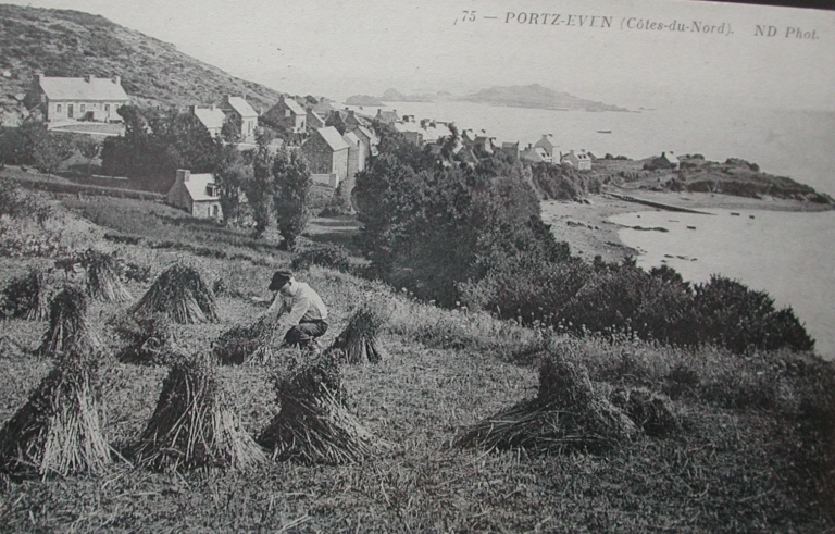 Vue du front de mer de Pors Even, remarquer les champs cultivés en lisière du village, début 20ème siècle (collection particulière)Immatriculation