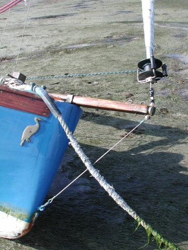 Vue des formes de l'avant : remarquer l'étrave ronde le foc à enrouleur sur le bout-dehorsImmatriculation