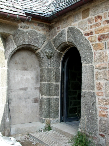 Vue des portes jumelles en plein cintre en granite gris, qui font la jonction entre les deux bâtimentsImmatriculation