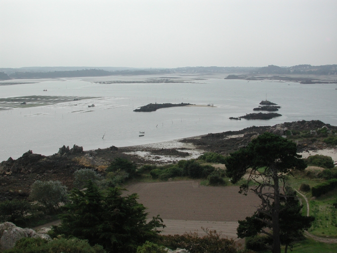 Vue de la plage aux Courlis et de la baie de Paimpol (parc à huîtres dans un enclos à proximité de la plage)Immatriculation