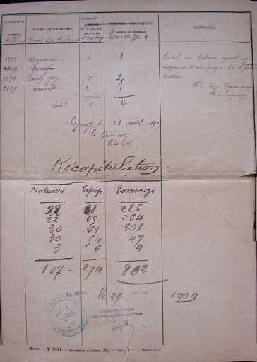Liste des bateaux de pêche armés à Loguivy en 1909 : récapitulatif (AD 22)Immatriculation