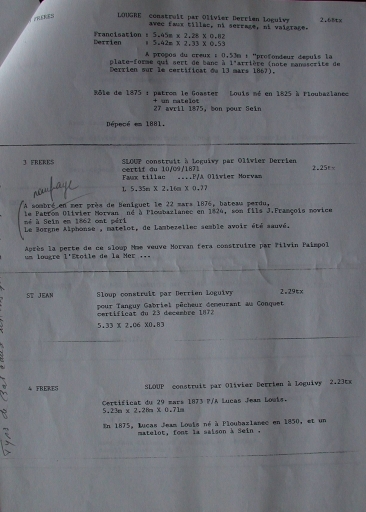 Bateaux, gréés en sloop, construits à Loguivy par Olivier Derrien en 1872-73, dont les 'Trois Frères' et le 'Saint-Jean' (collection particulière)Immatriculation