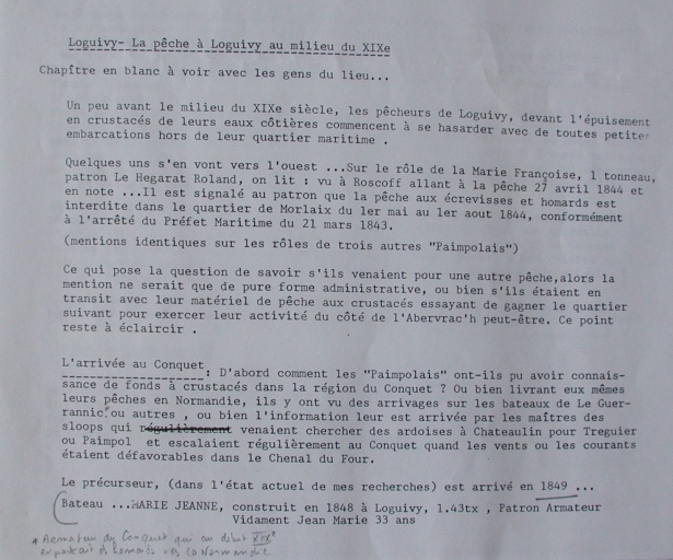 Le 1er homardier de Loguivy à l'Ile de Sein : 'Marie-Jeanne' à Vidament, construit en 1848 (texte de J.P. Clochon, collection particulière)Immatriculation