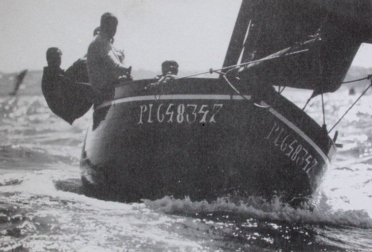 Vue de 'An Durzhunel' en régates aux fêtes de Ploumanac'h, avec 2 générations de marins-pêcheurs loguiviens à bord, dont Louis Le Bellec à la barreImmatriculation