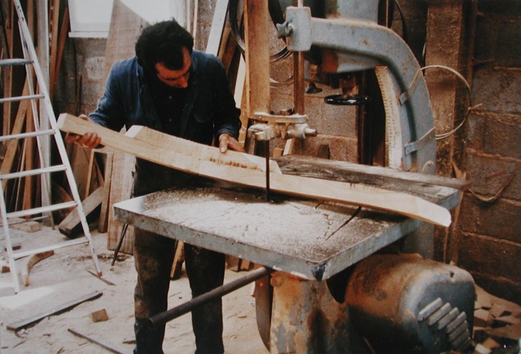 La construction de 'An Durzhunel' au chantier Yvon Clochet en 1984 : le sciage d'une membrure (F. Variot, collection particulière)Immatriculation