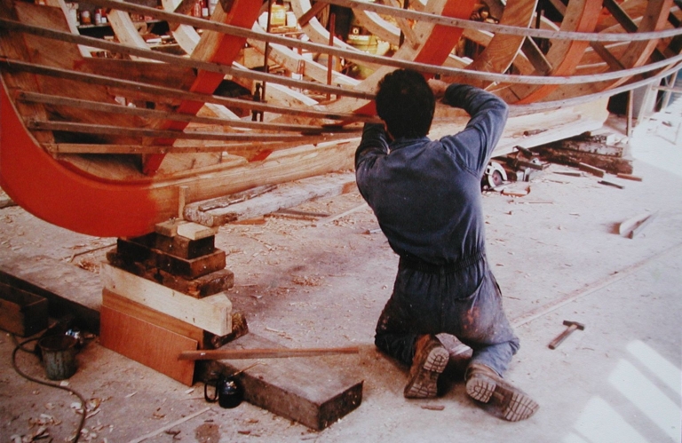 La construction de 'An Durzhunel' au chantier Yvon Clochet en 1984 : l'ajustage des lisses par rapport aux membrures (F. Variot, collection particulière)Immatriculation