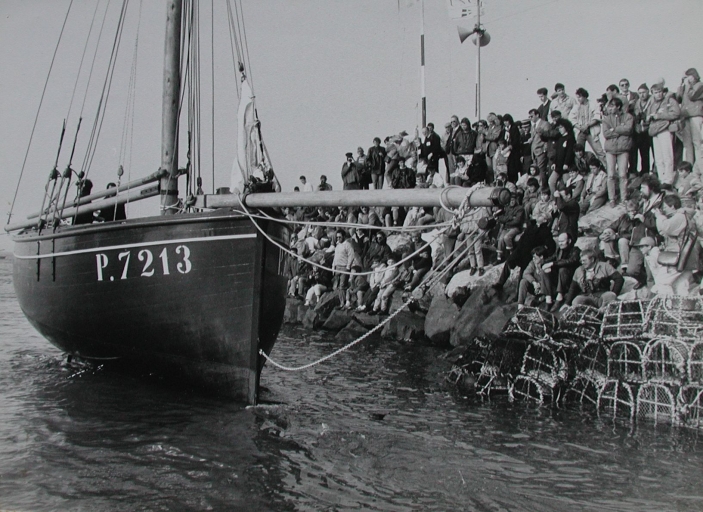 Le lancement de 'Enez Koalen' à Loguivy, avril 1989, avec le parrain Roger Le Bellec et la marraine Jeanne Kerleau (Noël Blin, collection particulière, Ecole de mer du Trégor)Immatriculation
