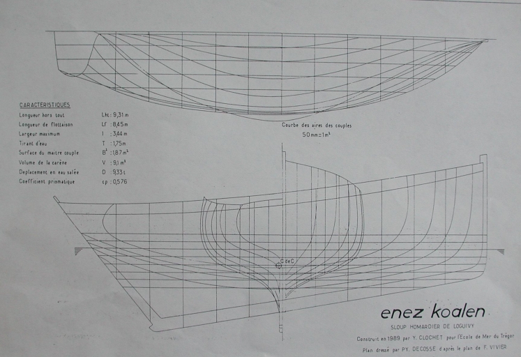 Plan de formes de 'Enez Koalen', d'après le plan de François Vivier (Pierre-Yves Decosse, collection particulière, Ecole de mer du Trégor)Immatriculation