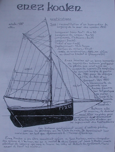 Fiche descriptive de 'Enez Koalen' : plan de voilure, d'après Ronan Merlateau, 1989 (collection particulière, Ecole de mer du Trégor)Immatriculation