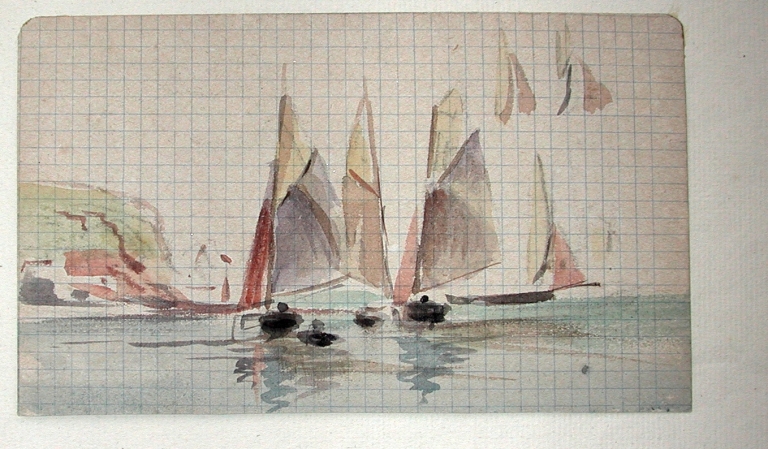Dessin aquarellé sur papier quadrillé de Louis-Marie Faudacq : voiliers de plaisance sur le Trieux (collection particulière)Immatriculation