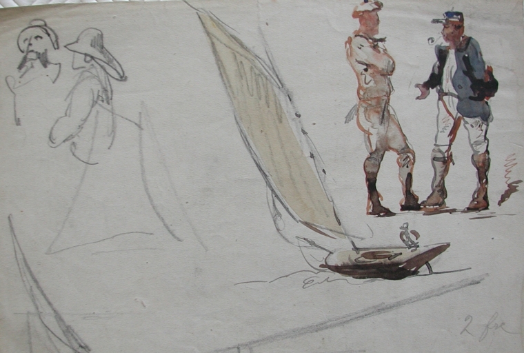 Dessin aquarellé de Louis-Marie Faudacq : marin en conversation avec un douanier (collection particulière)Immatriculation