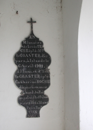 Vue d'un 'Mémoire' en bois des marins disparus en Islande par naufrage de leurs navires en 1881 et en 1901 (sous le porche)Immatriculation