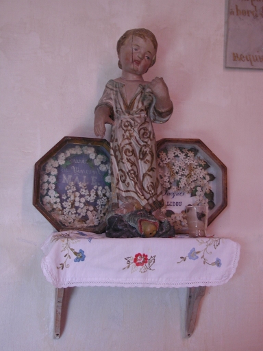 Vue d'un ex-voto en perles et en tissu, situé derrière une statuette d'angeImmatriculation
