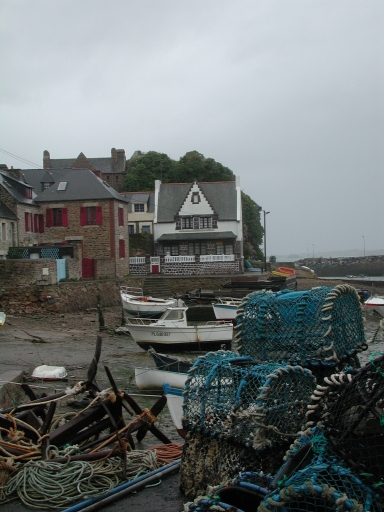 Vue des nouveaux casiers à araignées en plastique en dépôt sur le port de LoguivyImmatriculation