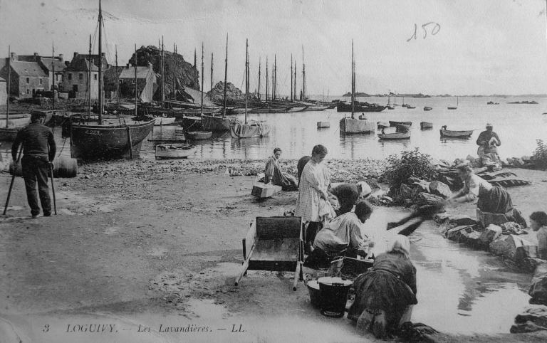 Le lavoir de Loguivy vers 1920 : remaqrquer les ustenciles des lavandières : la brouette, le lessiveuse, le battoir (carte postale, collection particulière)Immatriculation