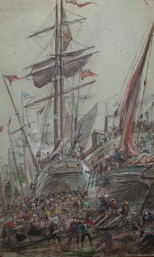 Dessin aquarellé de Faudacq : la pêche aux huîtres au port de Tréguier, fin 19ème siècle (collection particulière).Immatriculation