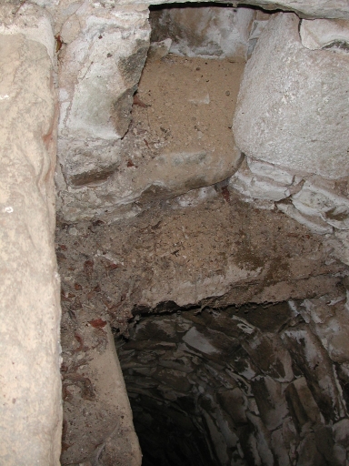 Vue de détail de l'intérieur du puits : remarquer la niche à droite et les traces de barreaux en ferImmatriculation