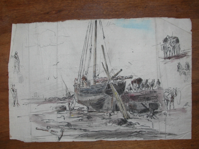 Dessin de Louis Marie Faudacq : sloop à l'échouage sur une grève, fin 19ème siècle (collection particulière)Immatriculation
