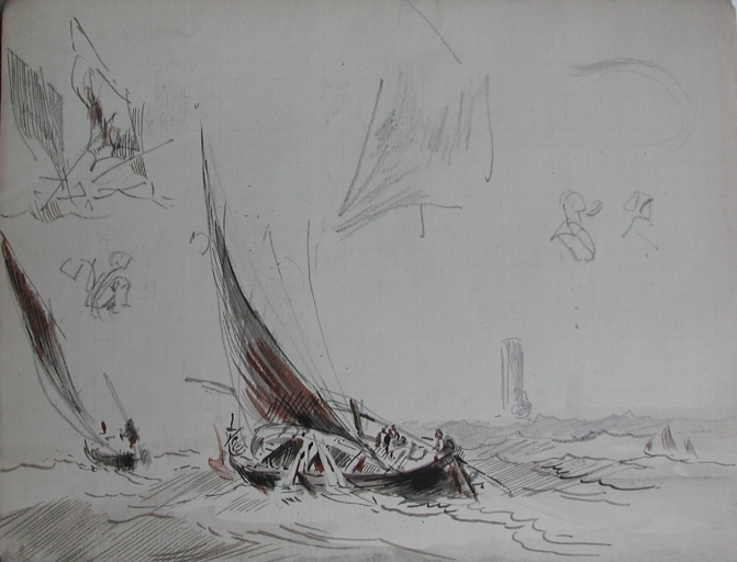 Dessin de Louis Marie Faudacq : vue des sabliers au près serré, avec leur grande misaine très apiquée, fin 19ème siècle (collection particulière)Immatriculation