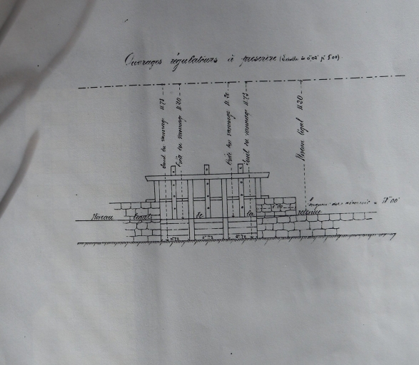 Plan de détail des ouvrages régulateurs à conserver du moulin de Kerousy vers 1860 (AD 22)Immatriculation