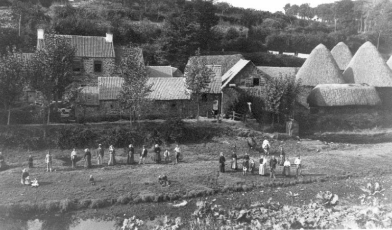 Vue du moulins de teillage de Kerousy, sur le Guindy au début du 20ème siècle : remarquer les meules de lin et les ouvriers en nombre (collection particulière)Immatriculation