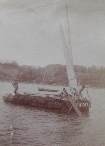 Photographie de Louis Marie Faudacq : bateaux goémoniers chargés en rivière de Tréguier, fin 19ème siècle : remarquer la manoeuvre de déhalage avec une perche plombée (tirage d'après plaque de verre, collection particulière)Immatriculation