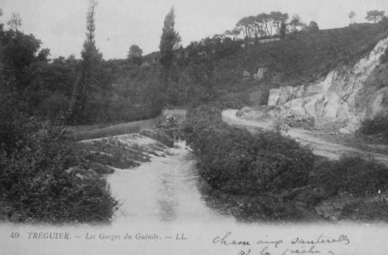 Les gorges du Guindy, la chaussée du moulin Coadou et en sur la colline, le 'capitole', appellation locale, début 20ème siècle (collection particulière)Immatriculation