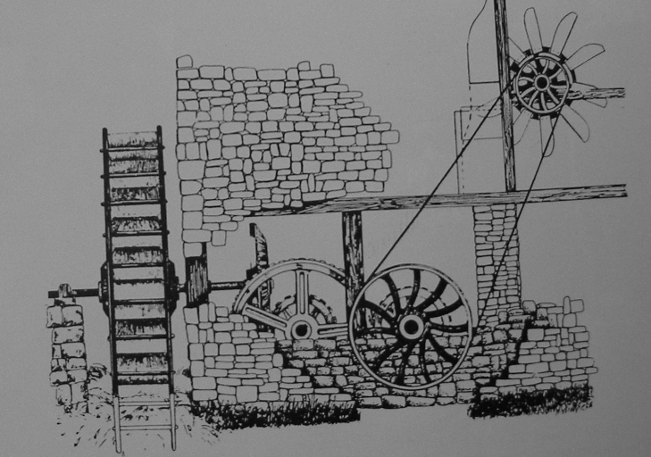 Dessin : vue du mécanisme d'entraînement des spatules du moulin de Keranré, en Vieux Marché, par Philippe Argoud (Armen, n° 28, 1990)Immatriculation