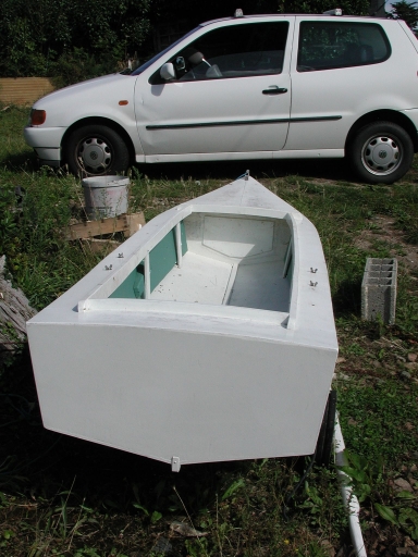 Vue d'un canoé long de 3 mètres construit par Albert Le Coadou en contre-plaquéImmatriculation