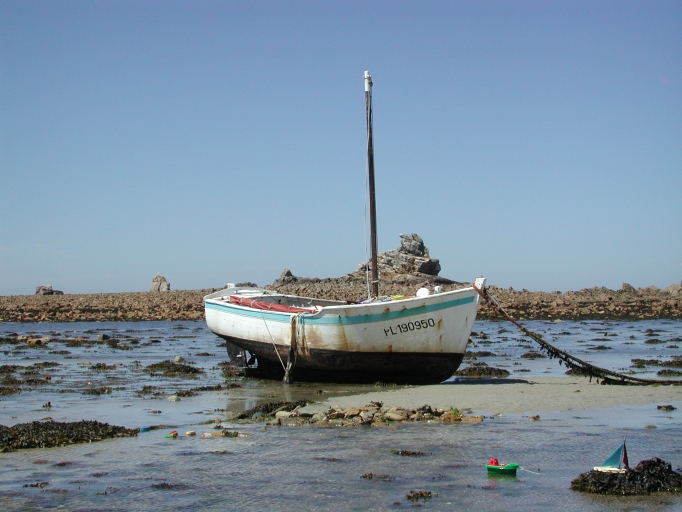 Vue du bateau de pêche plaisance 'Colibri' sur la grève de Poull Stripo, Pors Scaff : remarquer la coque comparable au bateau 'Armor'Immatriculation