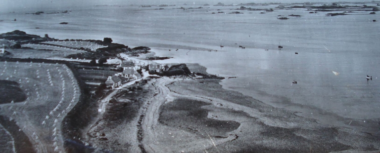 Vue du port du Castel, vers 1960-70 : remarquer les champs cultivés en bord de mer et la jetée construite, à marée haute (collection particulière)Immatriculation