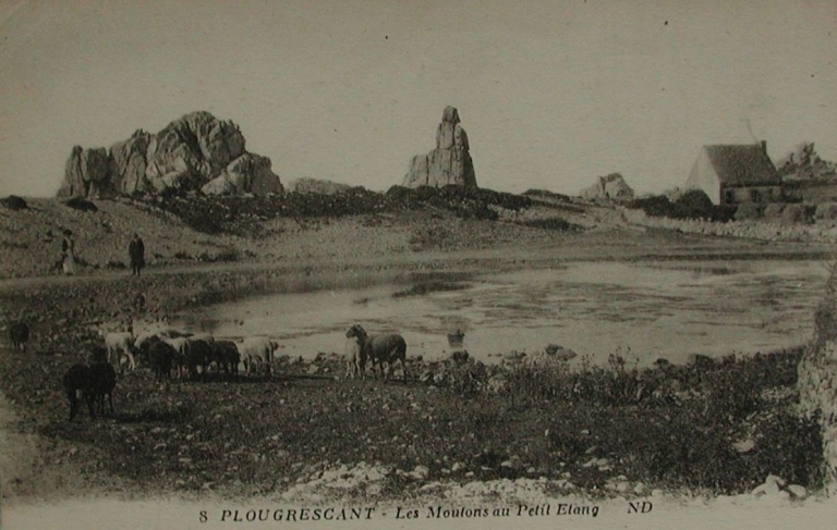 Vue de l'étang et du bâti littoral de Castel Meur au début du 20ème siècle : remarquer le pacage des moutons en liberté autour de l'étang du Castel Meur, la maison de 'Zant Okous', pêcheur de praires (carte postale, collection particulière)Immatriculation