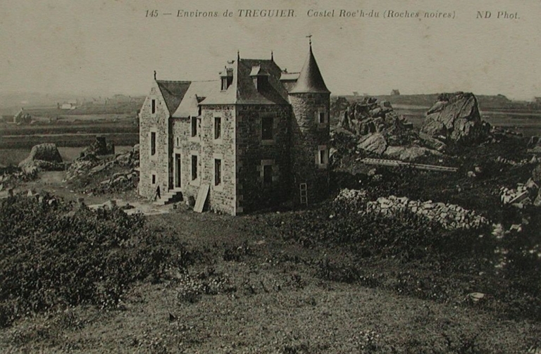 Plougrescant, Castel Roc'h Du. Ancien manoir de la famille Derode, agrandi par la suite, près de Pors Bugalé, planté de pins (carte postale, collection particulière)Immatriculation