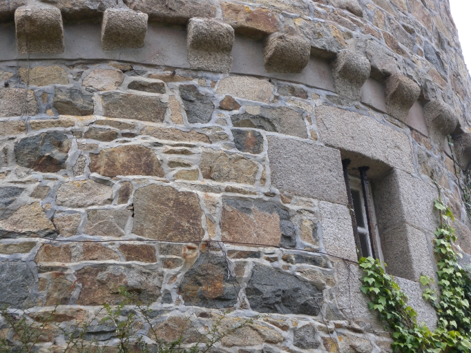 Vue de détail de la maçonnerie : remarquer les corbaux en pierre de taille au niveau du 1er étage à ressaut sur modillonsImmatriculation