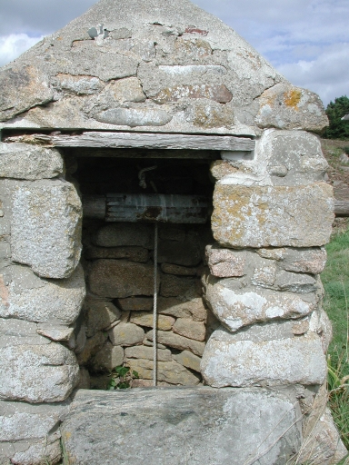 Vue de détail de l'ouverture du puits : remarquer la dalle de schiste qui sert de linteau et la margelle également en schisteImmatriculation
