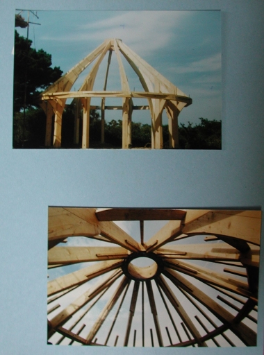 Vue de la charpente avant son installation : remarquer les poutres en biais (collection particulière)Immatriculation