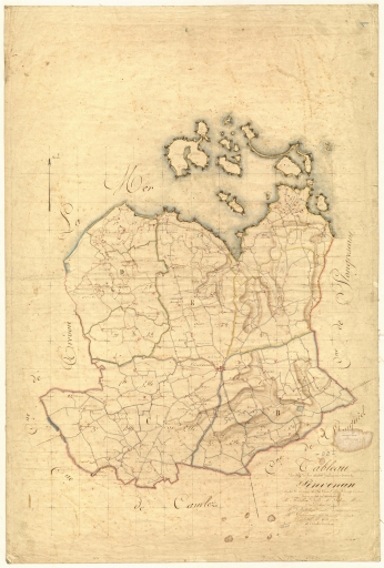Extrait du cadastre de 1834, tableau d'assemblage : moulins à eau de Donan et de Doval, près de Coat Claëren, aujourd'hui en ruines (AD 22)Immatriculation
