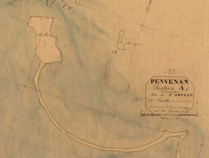 Extrait du cadastre de 1834, A1ère feuille : Enez Illiec, non bâtie : remarquer le cordon de galets (AD22)Immatriculation