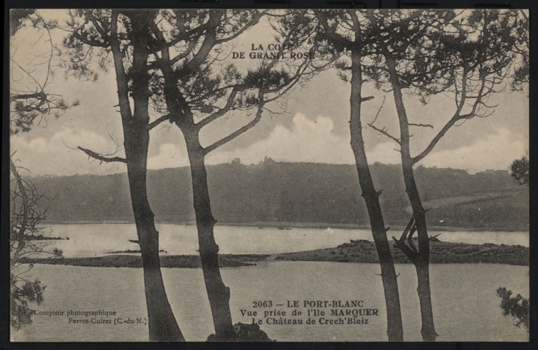 Vue prise de l'Île Marquer : le château de Crec'h Bleiz, vers 1904-1908 (carte postale, AD 22)Immatriculation