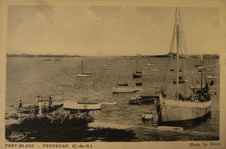 Le Port-Blanc : bateau de pêche langoustier devant le mur de quai, 2ème quart 20ème siècle (collection particulière)Immatriculation