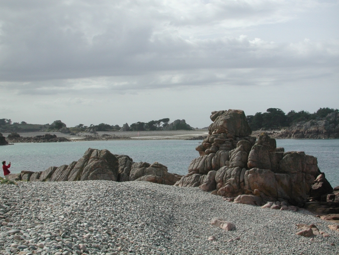 Vue des rochers et des îlots sur lesquels s'appuient les cordons de galets (double tombolo) pour former anse et étangs, au Nord du moulinImmatriculation