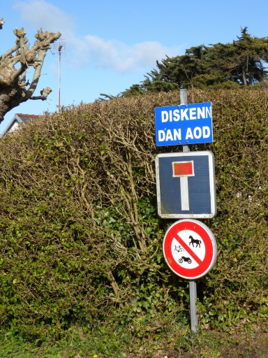 Panneau de signalisation en breton d'une ruelle menant au front de mer de la baie : 'Disken d'an aod'Immatriculation